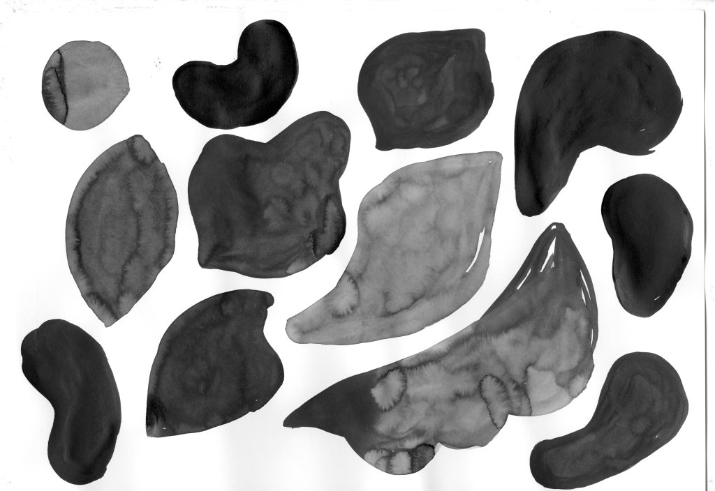 Process, skiss av former i tusch som blev underlag för mönstret. Inspirerat av mellanrumsformerna och känslan av att befinna sig inuti en trädkrona.