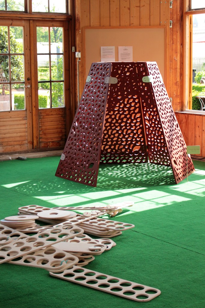 Ett skolprojekt i samarbete med Alfons Åbergs kulturhus som sedan valdes ut att genomföras och installeras på deras veranda med invigning våren 2017. Utgångspunkten var böckerna om Alfons där jag inspirerades av Gunilla Bergströms illustrationer och hur hon använder färgkontraster, ljus och mörker. Det ledde vidare till kontraster ute -och inne och därigenom kojan. Jag inspirerades också av en klassresa till Japan där vi besökte olika slags lekplatser, studios och arkitektkontor, och jag tittade extra mycket på olika slags kojor. Själva formen kommer ur känslan och upplevelsen att befinna sig inuti en trädkrona och ljusets spel genom lövverken. Omnämnd i tidningen: Arkitekten